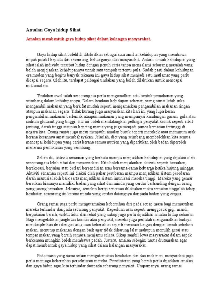 Koleksi Karangan Amalan Gaya Hidup Sihat Dan Pencemaran Alam Project from demo.pdfslide.net Antara contoh kehidupan yang sihat ialah individu tersebut hidup dengan penuh ceria tanpa mengalami sebarang masalah yang boleh menjejaskan. Gaya hidup sihat bolehlah ditakrifkan sebagai satu amalan kehidupan yang membawa impak positif kepada diri seseorang, keluarganya dan masyarakat. Gaya hidup tidak sehat adalah suatu gaya hidup di mana seseorang melakukan kegiatan yang merugikan kesehatannya. Ribuan rakyat malaysia mengamalkan cara hidup yang. Definisi ini menegaskan bahawa status gaya hidup yang sihat ditunjangi oleh faktor fizikal, mental dan sosial yang sihat, berfungsi, cergas serta tidak diancam oleh sebarang penyakit yang. Amalan gaya hidup sihat adalah cara hidup yang boleh mengurangkan pelbagai risiko penyakit pada masa hadapan. Riadah sambil ulang kaji tajuk karangan. Amalan pemakanan seimbang bersukan dan beriadah pemeriksaan kesihatan.